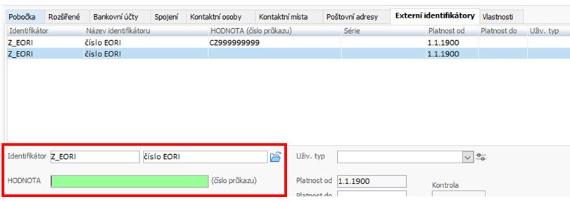 - EORI číslo zadáte na firemní větě jako externí identifikátor