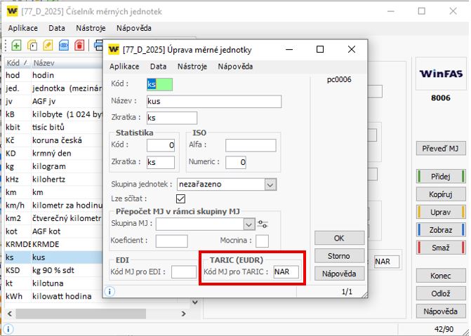- Anebo svým stávajícím měrným jednotám v číselníku *8006 připište "kód MJ pro TARIC". Doklady nadále budete pořizovat ve vašich měrných jednotkách a pro hlášemí budou překlopeny dle tohoto údaje: