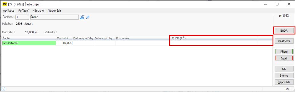 Pokud nevyužíváte šarže položek a nepotřebujete nutně sledovat počet přijatých a vydaných RČ, pak vám postačí pracovat s údajem "EUDR", který naleznete v pořízení položek dokladu na záložce Další údaje 2: