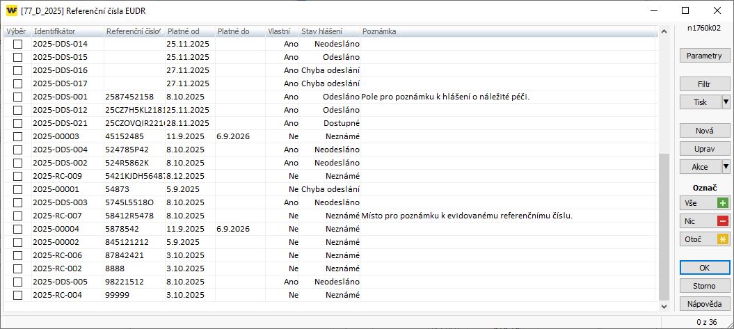 - z KUKu můžete vybrat jedno a více existujících referenčních čísel, anebo přes tl. Nová pořídit zcela nové, které se automaticky zapíše do aplikace *1642 Evidence RČ a EUDR.