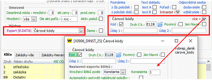 - Na záložce Speciality v sekci Výstup vyberte Export (tl. DATA): Čárové kódy