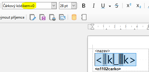 - POZOR! U čárových kódů (tj. písmo carko_tisk) je třeba font upravit dosazením tzv. kerningu ve formátu FONT:PARAMETR=HODNOTA - tzn., za písmo Čárkový kód dopište informaci ":kern=0"