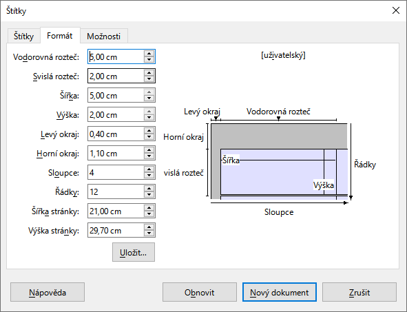 - Na záložkách Formát a Možnosti zajistíte rozdělení stránky na počet a rozměry štítků