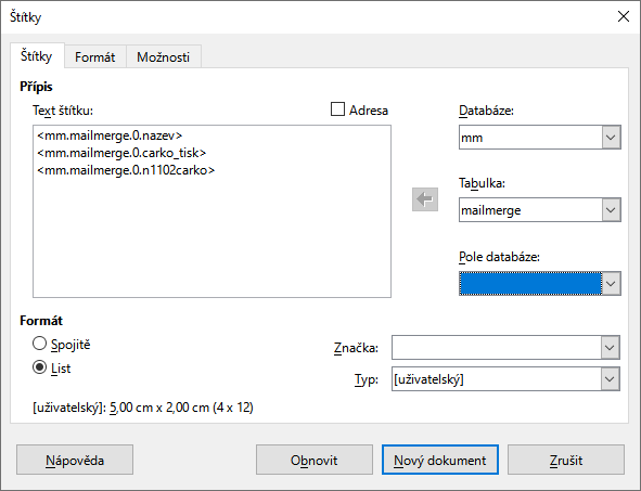 - Záložka Štítky slouží k nahrání textu štítků z databáze mm, tabulka mailmarge: